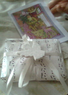 Comincio con il pacchetto speditomi da Rosetta, deliziosamente avvolto in una pagina di spartito STUPENDA, con un angioletto che ho già messo da parte per il prossimo Natale, accompagnato da un biglietto dolcissimo.